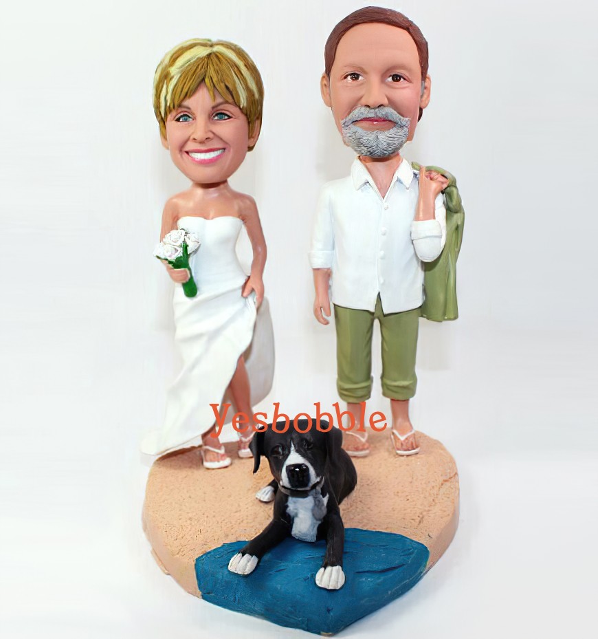 Bobblehead Wedding Couple with Pet on Beach